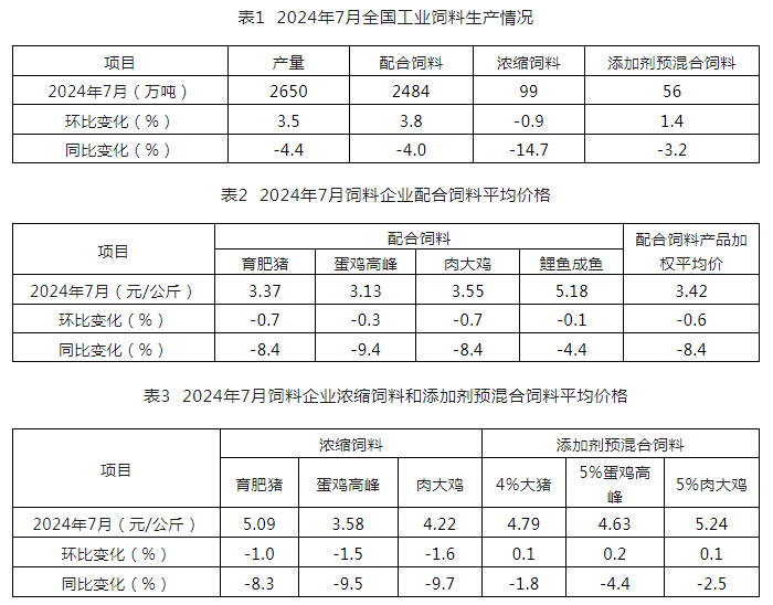 2024年7月,全国工业饲料产量2650万吨,环比增长3.5%,同比下降4.4%。主要配合饲料、浓缩饲料产品出厂价格环比、同比均呈下降趋势,添加剂预混合饲料产品出厂价格同比小幅下降。饲料企业生产的配合饲料中玉米用量占比为29.8%,同比增长2.4个百分点;配合饲料和浓缩饲料中豆粕用量占比为12.4%,同比下降1.4个百分点。